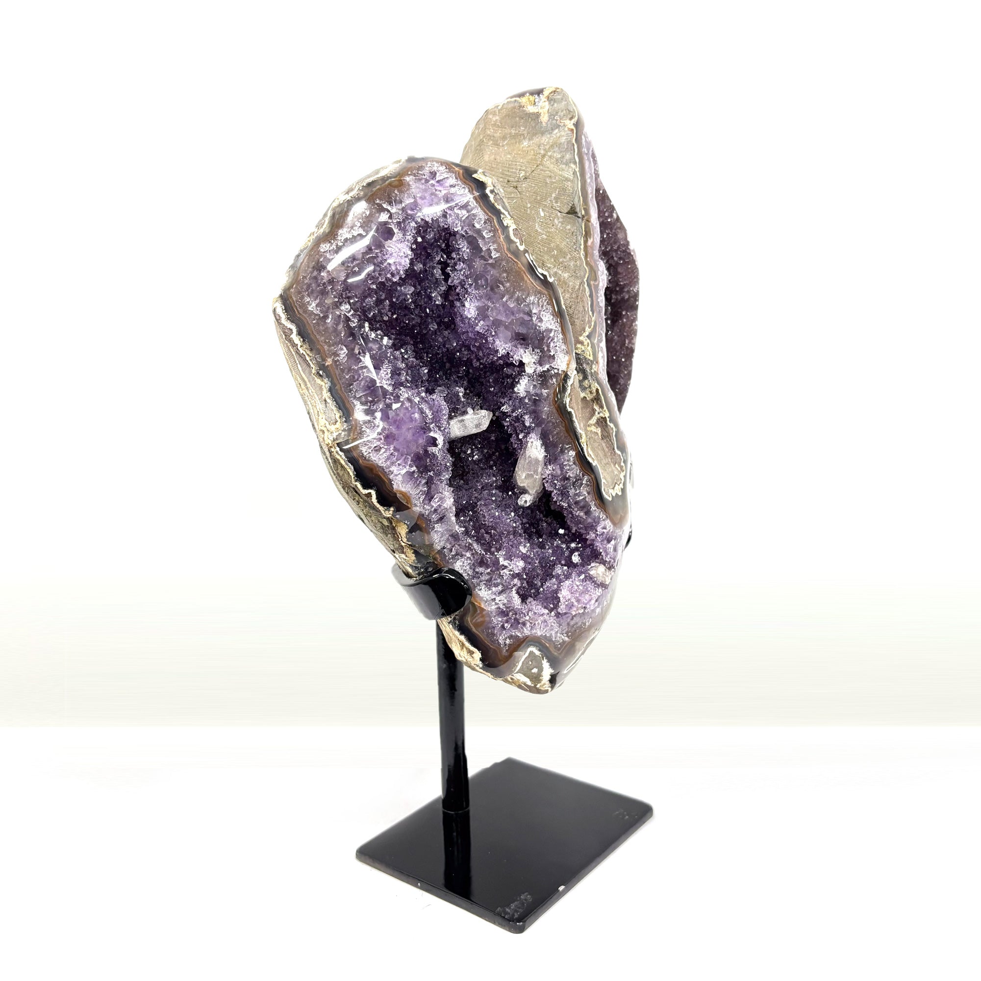 The geode's natural, raw appearance adds a touch of rustic charm to any space, while its smooth, polished interior reveals a mesmerizing crystal formation. This unique piece is not only a beautiful decorative item but also a powerful tool for energy healing and meditation. Amethyst is known for its calming and healing properties, making it an ideal crystal for promoting tranquility and spiritual growth. Elevate your home decor and personal well-being with this exquisite Natural Purple Amethyst Crystal Geode on Stand.