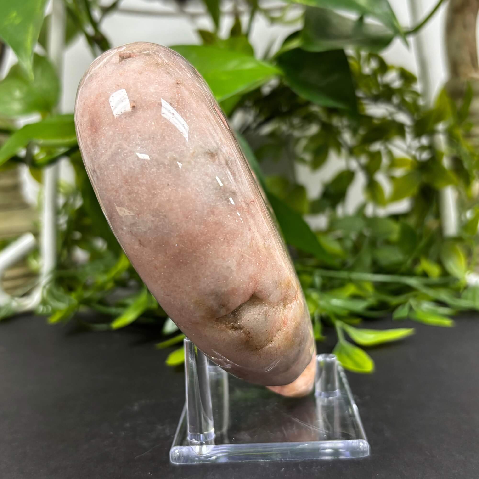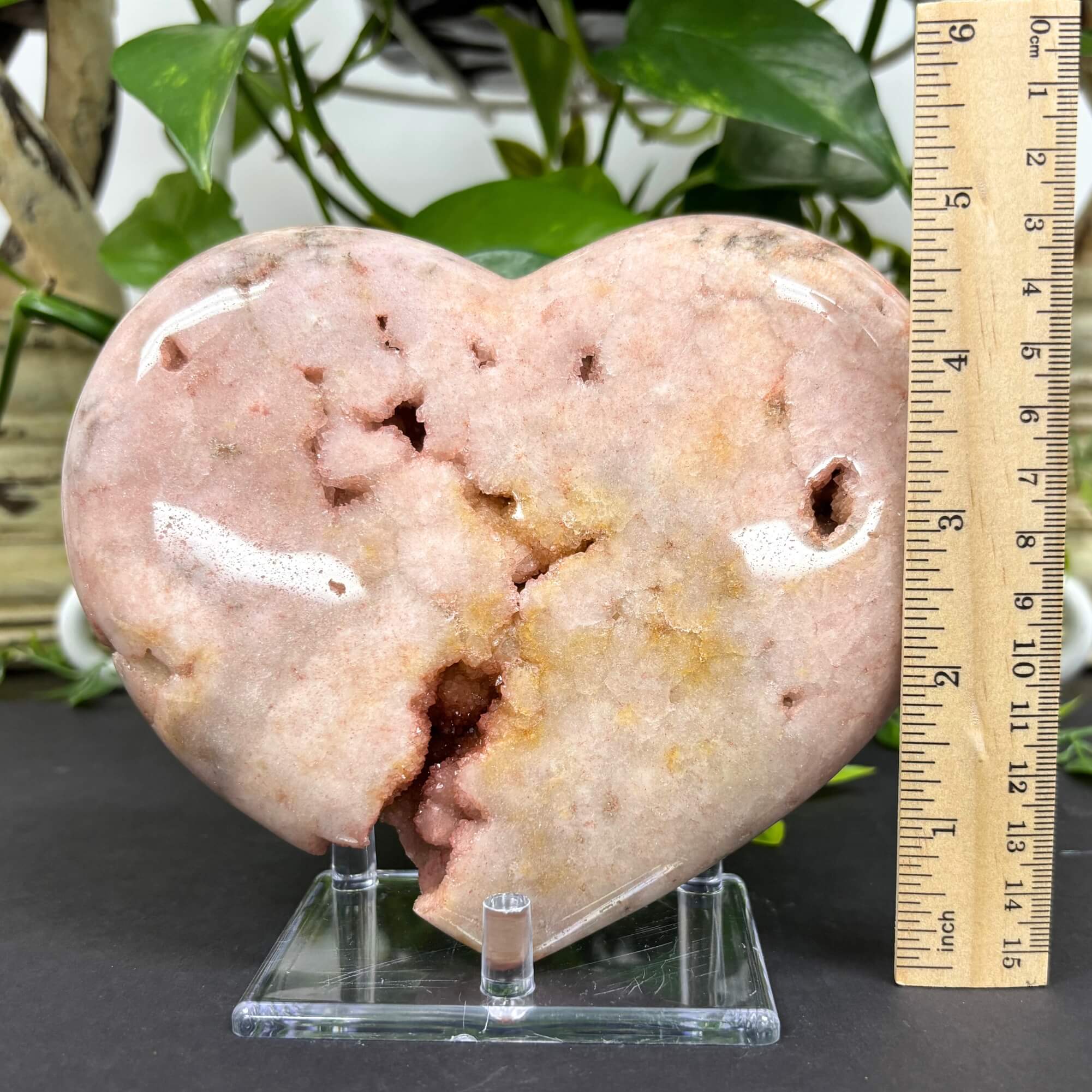 This beautifully polished pink amethyst heart measures 6 inches wide by 5 inches tall and showcases soft rose tones with natural variations throughout the surface. The piece features several sparkling druzy pockets that add texture and visual depth, highlighting the stone’s unique crystalline structure. With its smooth finish and eye-catching details, this heart-shaped specimen makes a stunning addition to any decor or mineral collection.