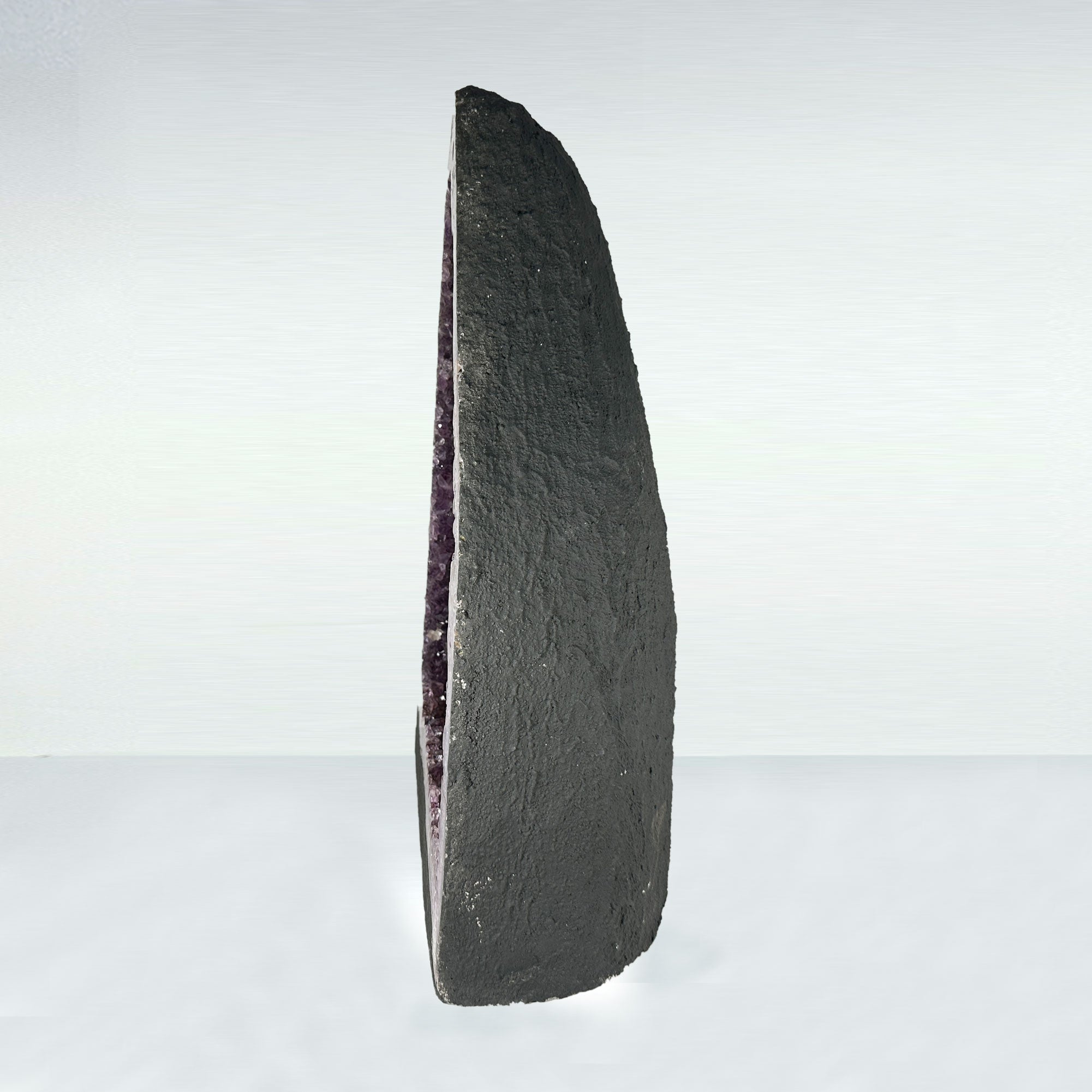 This crystal cluster showcases a deep purple amethyst geode with irregularly shaped crystal spires that reflect light beautifully. It is made from natural deep purple amethyst stone and is finished with a polished surface to highlight its rich color.