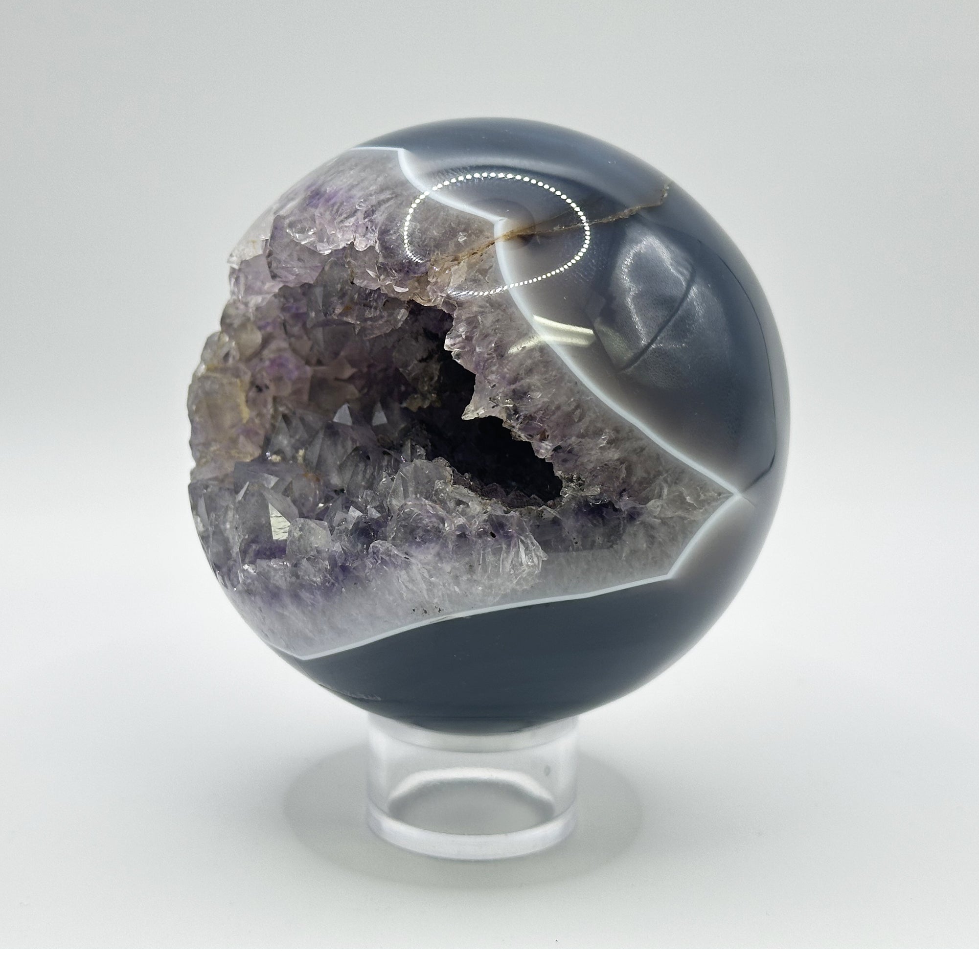 This amethyst sphere is a stunningly polished piece that showcases the rich purple tones and natural banding characteristic of high-quality amethyst. Featured on this sphere are eye-catching crystals that sparkle beautifully once met with light. With an approximate weight of 1.82lbs, this Amethyst sphere will make a perfect addition to any home or collection!
