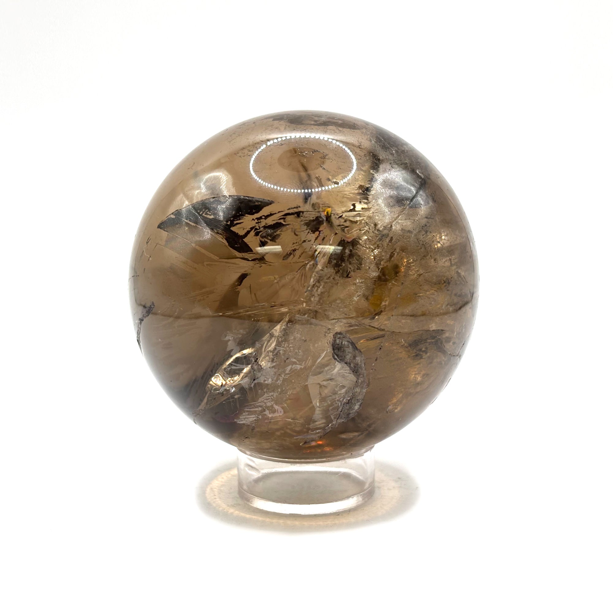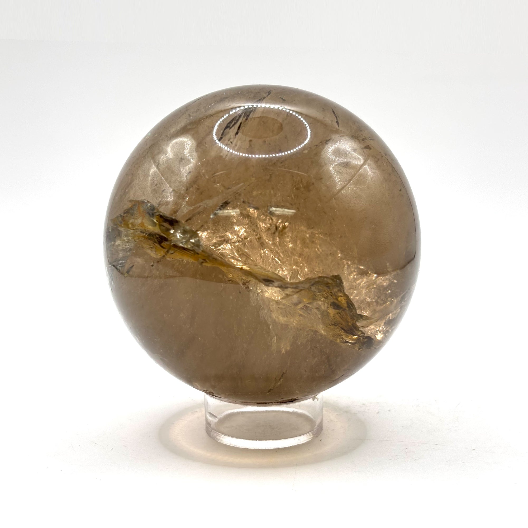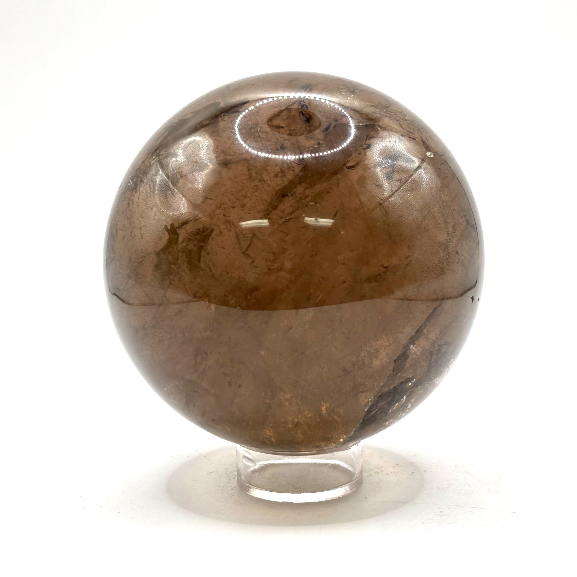 Introducing our Natural Smoky Quartz Crystal Sphere, a captivating addition to your space. crafted from high-quality, genuine Smoky Quartz crystal. The crystal's natural smoky hue ranges from light brown to deep grey, with a smooth, polished surface that catches the light beautifully. It's supported by a sleek, black metal stand for display.