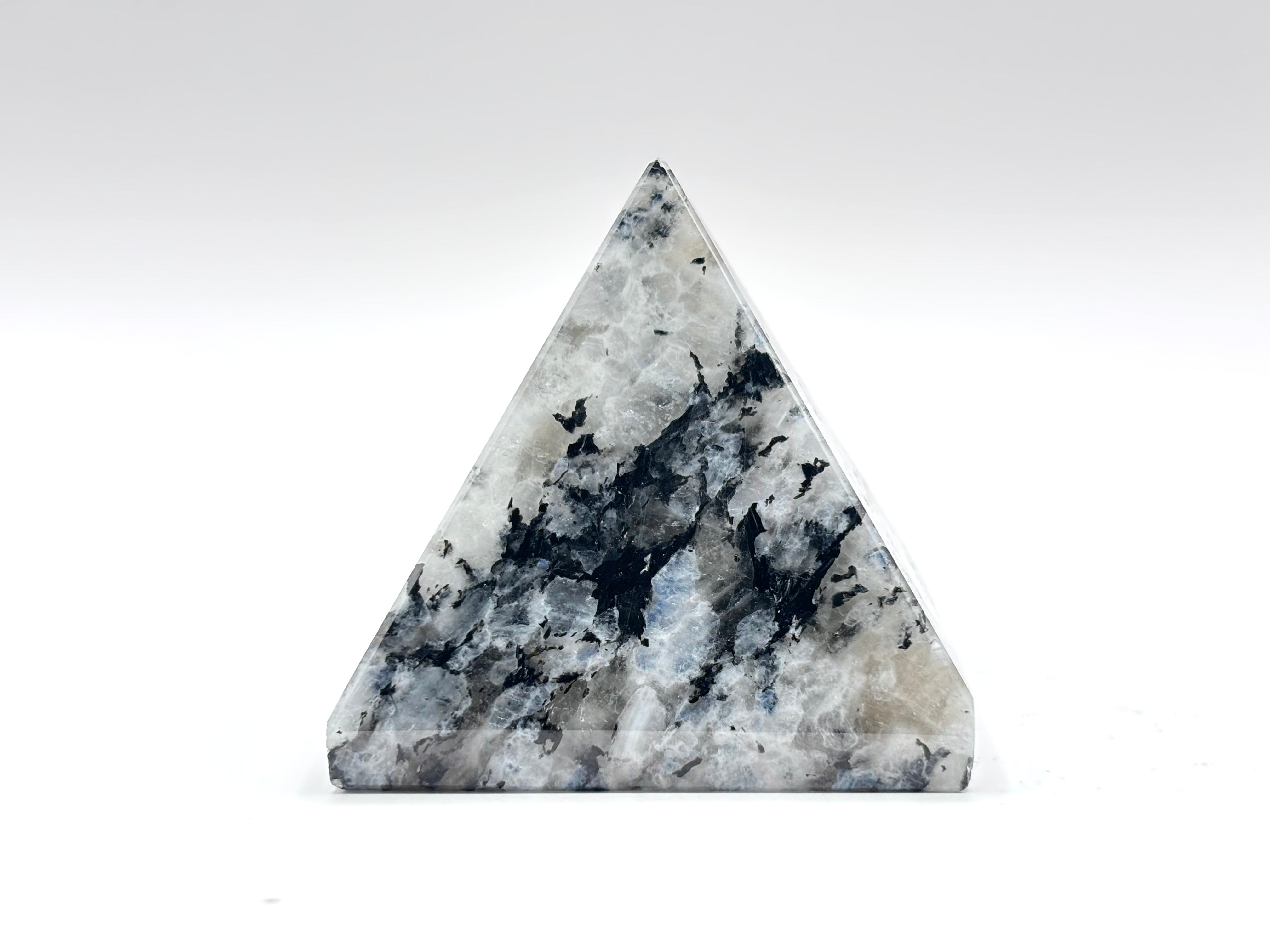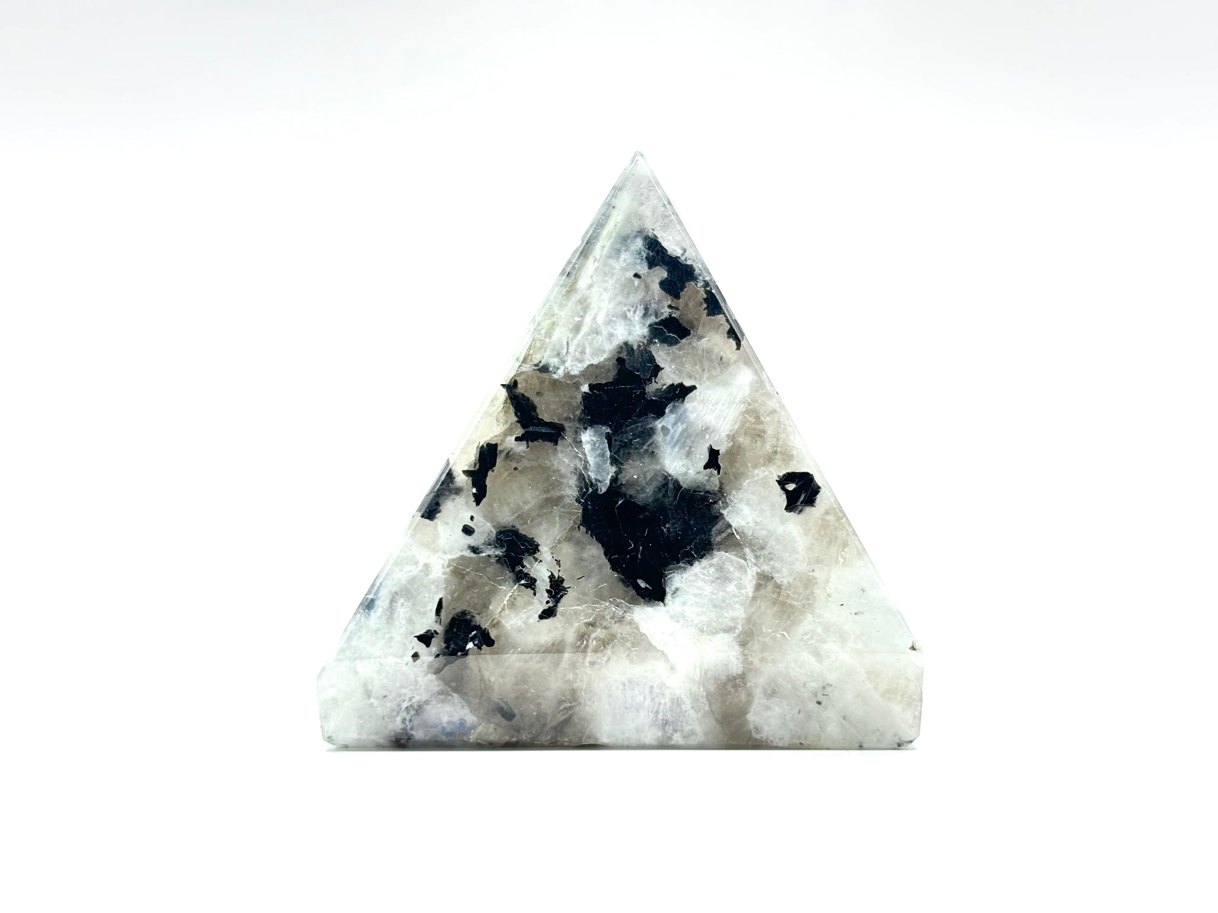 This Rainbow Moonstone Pyramid features natural inclusions of Black Tourmaline. The pyramid is made from genuine, high-quality crystals mined in India. Its iridescent rainbow moonstone face shines with a lustrous sheen, while the black tourmaline inclusions add a touch of mystery and elegance. The pyramid shape is ideal for meditation purposes, amplifying your spiritual energy and promoting inner peace.