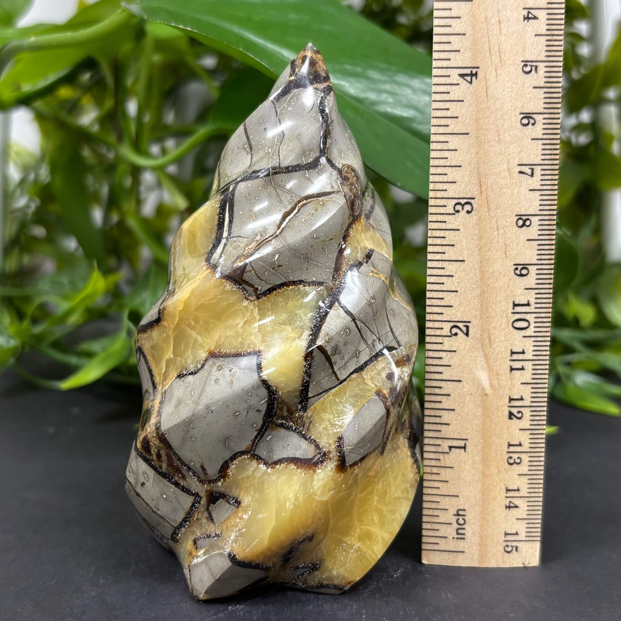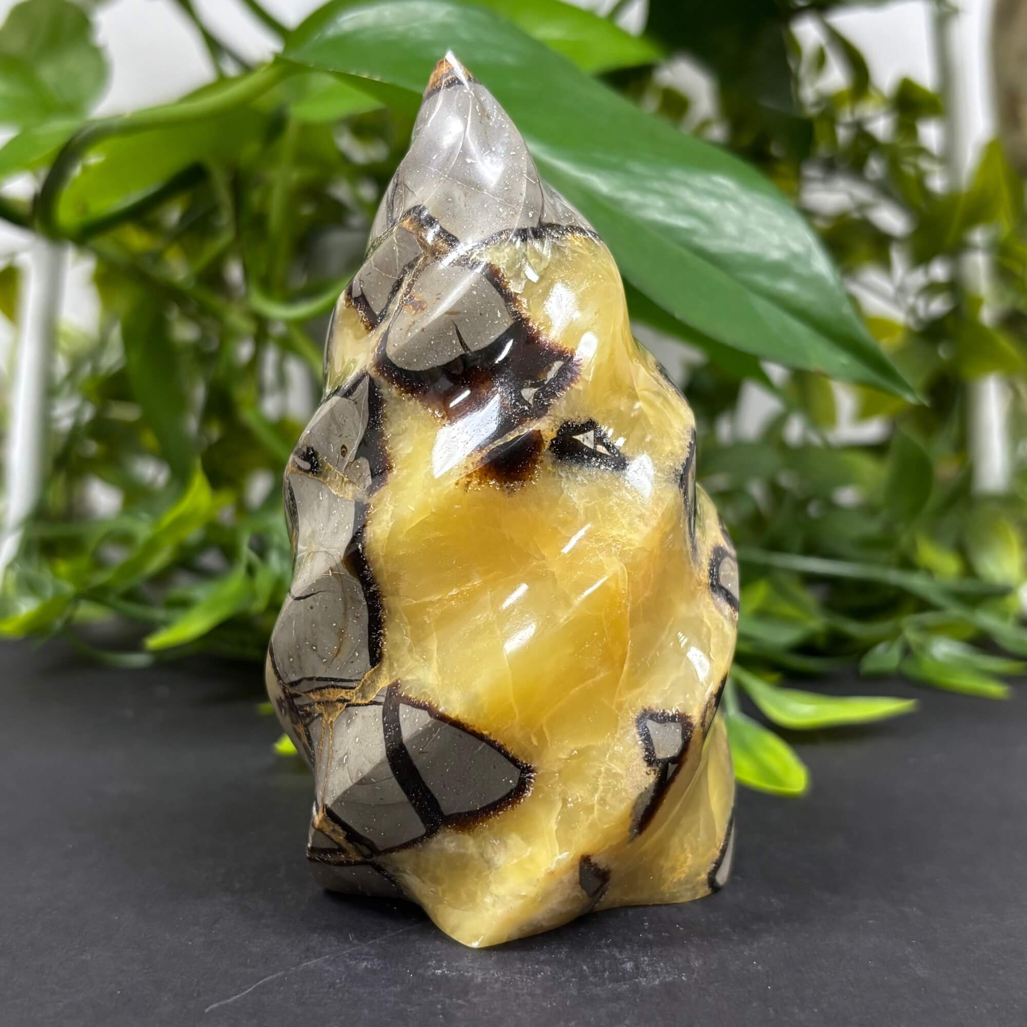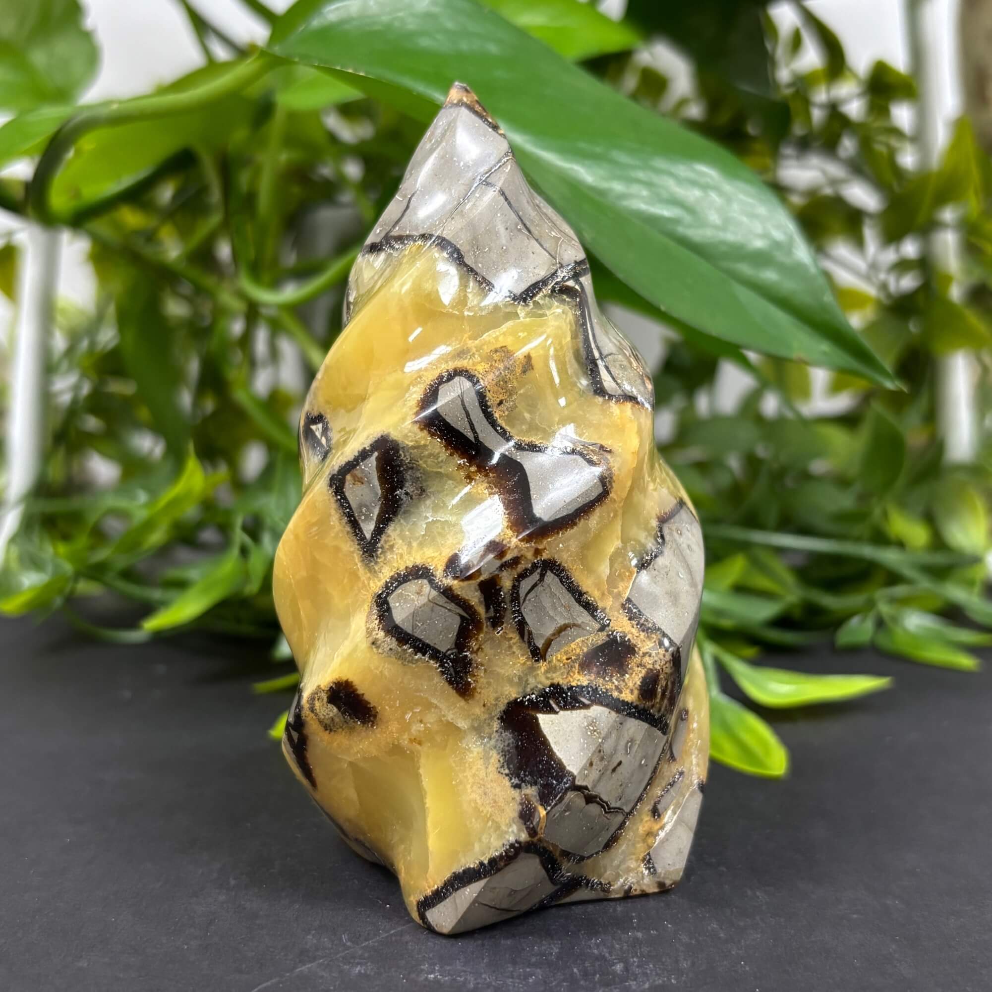 This septarian Flame from Madagascar is a visually striking stone that showcase a unique combination of earthy colors and natural geometric patterns. Formed millions of years ago, septarian is a blend of minerals—typically calcite, aragonite, and limestone—creating a bold mosaic of golden yellow, brown, and gray tones. Polished into a freeform shape, this piece highlights the stone’s natural cracks and separations, which resemble a dragon’s skin, earning it the nickname “Dragon Stone.”