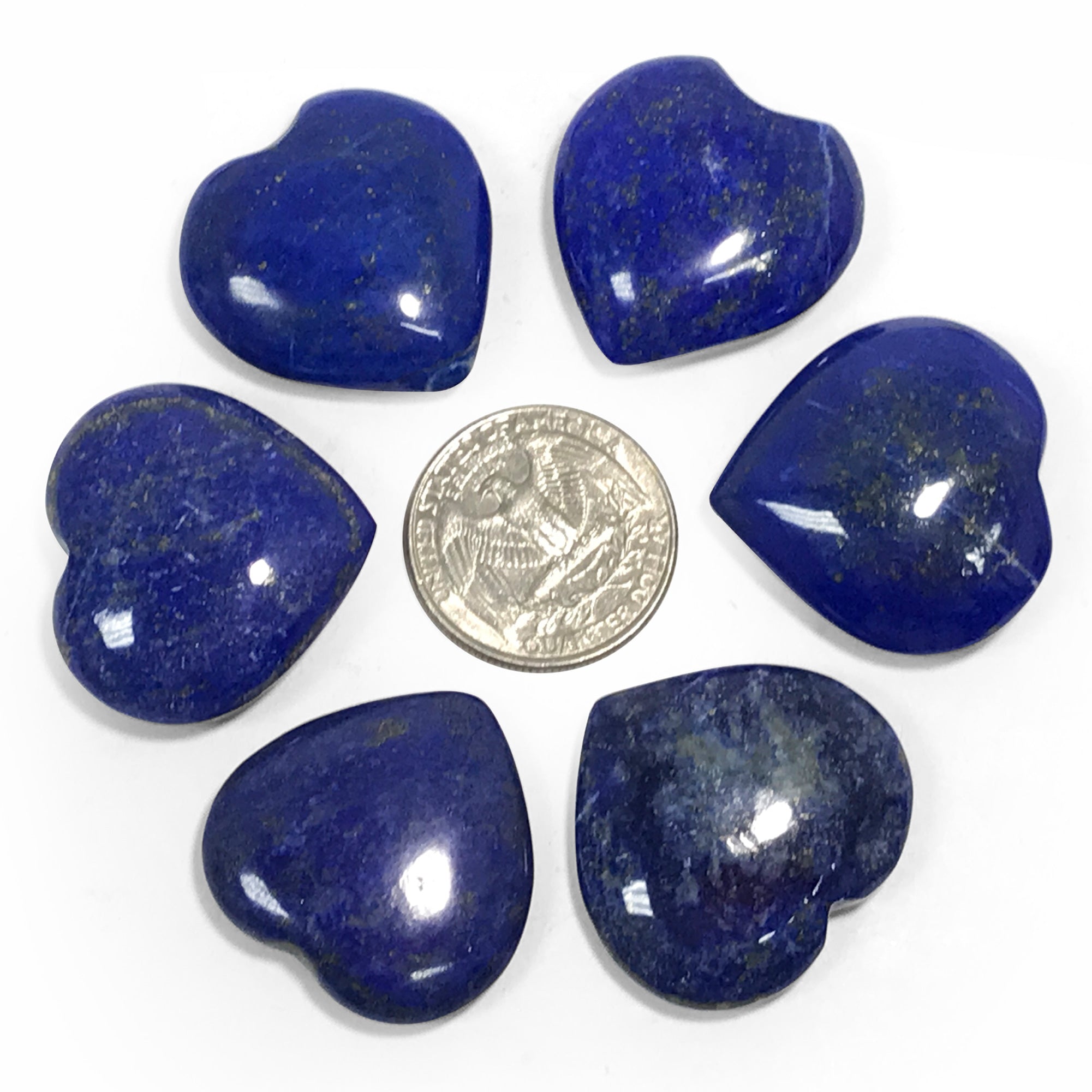 These beautiful Lapis Lazuli hearts contain a rich and vibrant shade of royal blue accompanied with scattered flecks of a golden shade provided by the lovely Pyrite found within each heart. Along with these stunning colors are hints of white and grey. Each heart has a smooth and round texture as well as a gloss like finish. A great addition to any collection!
