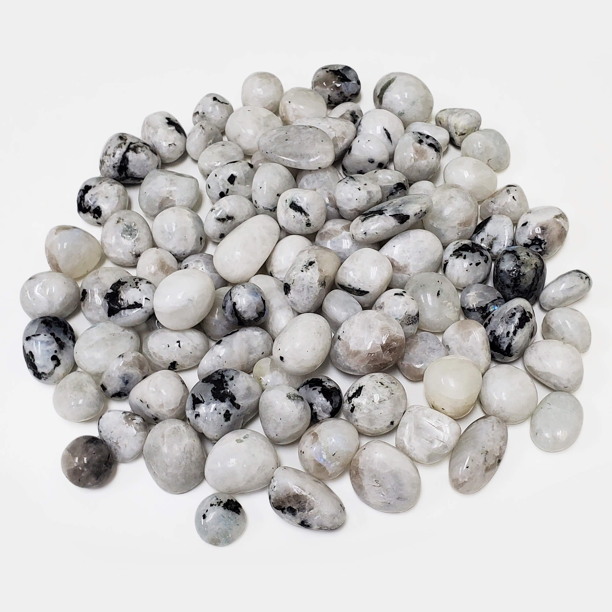 Natural Rainbow Moonstone Tumbled Stone Gemstones - 1 lb Elevate your inventory with premium rainbow moonstone tumbled stones, sourced and curated for wholesale buyers. Each 1 lb bulk lot features authentic, naturally polished gemstones displaying the signature adularescence and iridescent flash that collectors and retailers seek. Perfect for crystal shops, metaphysical retailers, gift boutiques, and jewelry makers looking to stock high-quality specimens. These tumbled stones offer excellent value for resale, with consistent sizing ideal for display cases, craft projects, or individual sales. Rainbow moonstone's ethereal beauty and widespread appeal make it a reliable bestseller in the gemstone market. Wholesale pricing available for bulk orders.