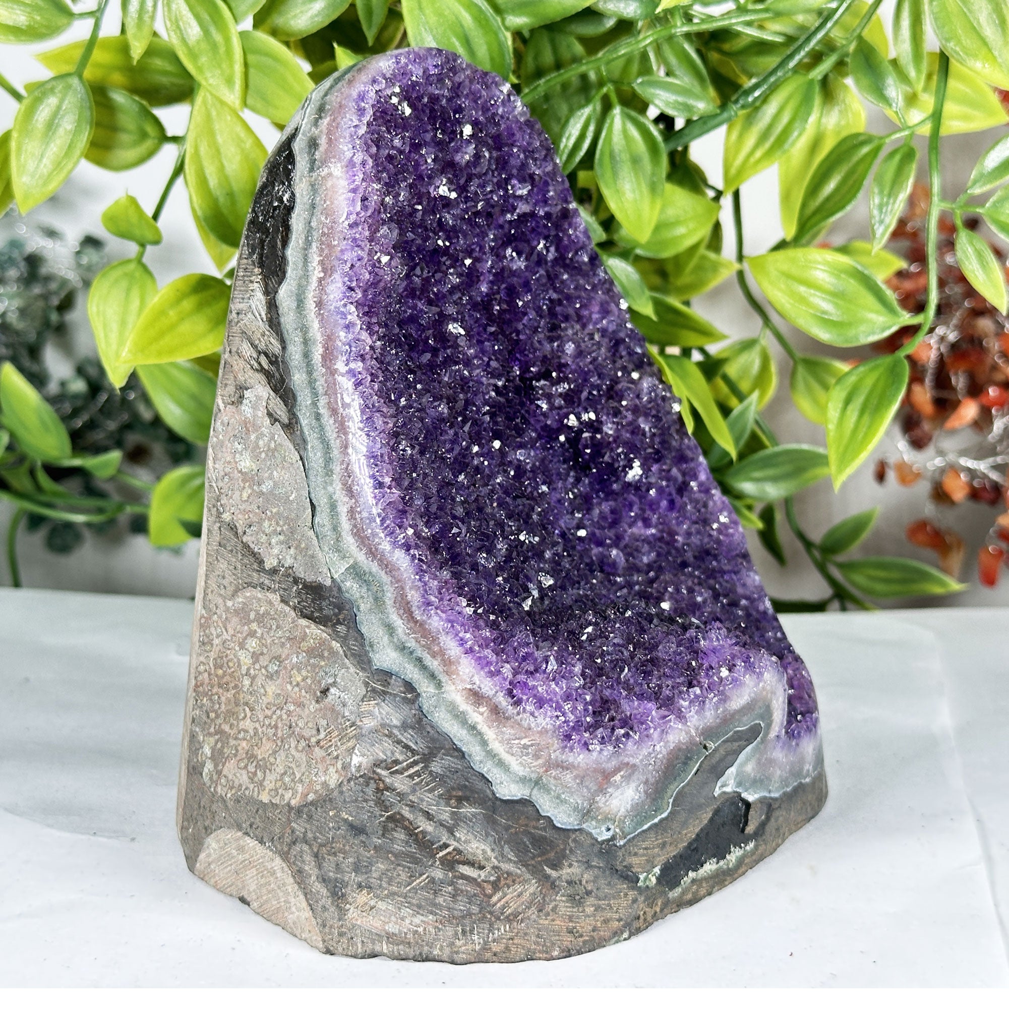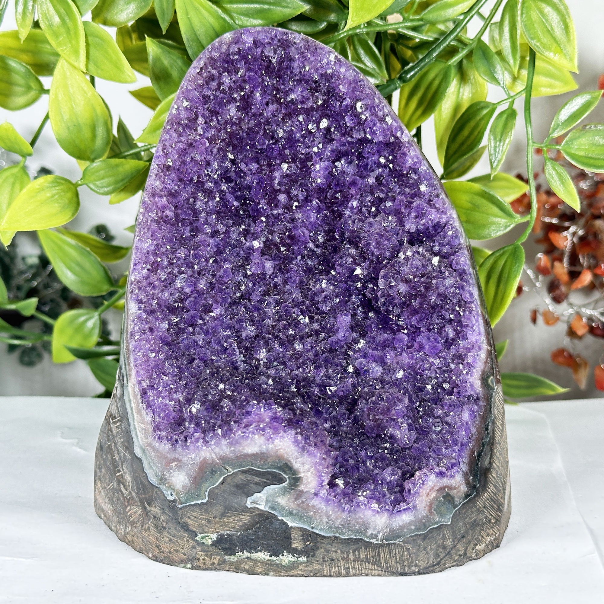 Natural amethyst druzy geode crystal cluster with polished base and vibrant purple hue from Brazil.
